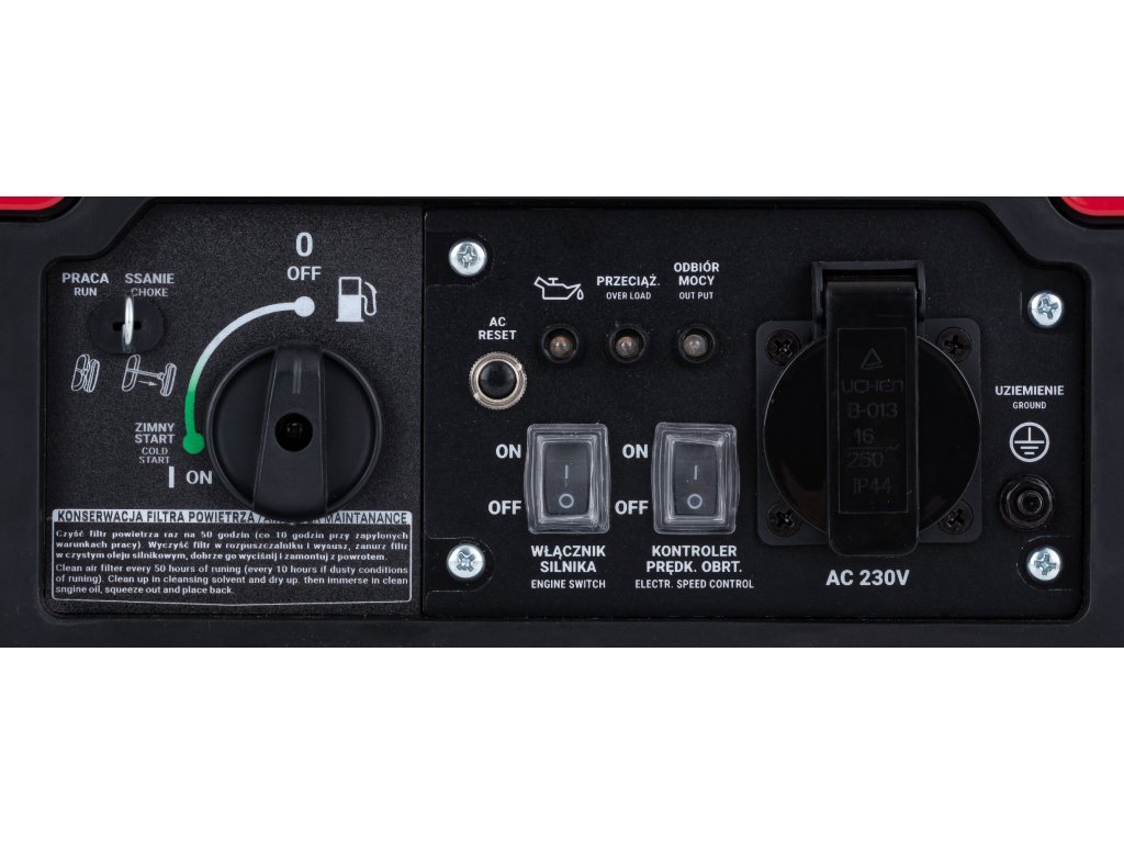Die Steuerung ist dank des übersichtlichen Bedienfelds besonders einfach. Hier finden Sie Betriebsanzeigen, Schutzfunktionen gegen Überlastung und Kurzschluss, Ölmangelsicherung, eine Reset-Taste zur Systemwiederherstellung sowie den Netzschalter.